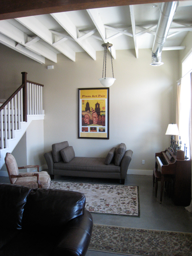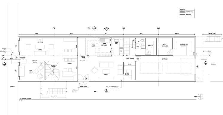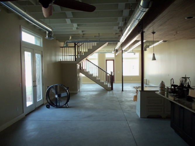The design sought to create an open, loft layout of the ground floor living, dining, kitchen and den areas. Four bedrooms and home office occupy the second floor. The budget was minimal at $60 a square foot. Flooring consisting of bare concrete on the ground floor and reclaimed wood on the second floor. Exposed duct work and ceiling framing add to the character of the space.