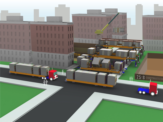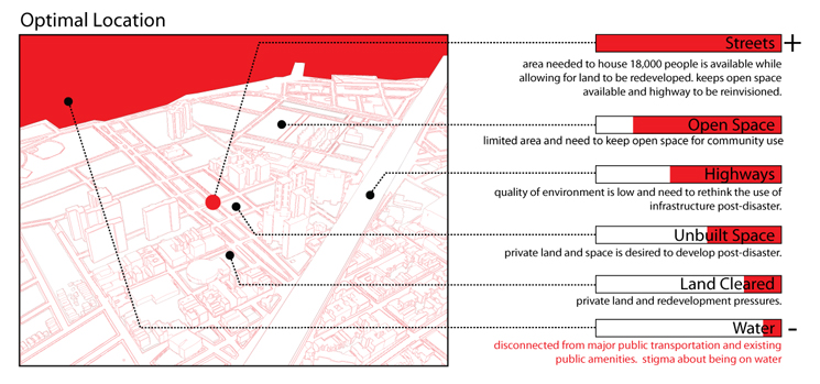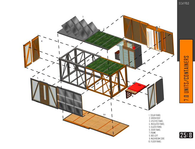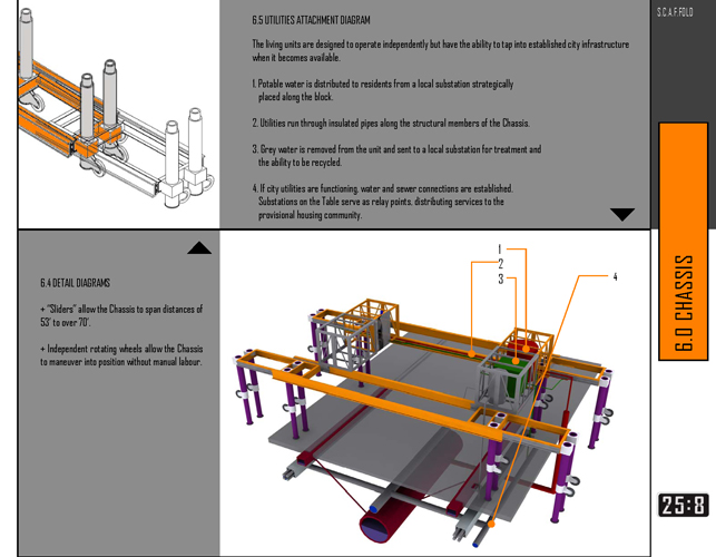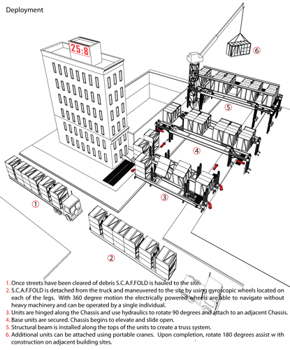 S.C.A.F.FOLD is a fluid system of relief and a tactical armature for urban recovery. From the moment a disaster strikes, this system provides the backbone network which enables debris to be cleared and recovery to begin. Traditionally, large swaths of land must first be cleared before provisional housing can be deployed. Immediately after an emergency the first areas to be cleared are the transportation arteries. The S.C.A.F.FOLD system capitalizes on this condition by deploying an integrated housing system above critical pathways of infrastructure including highways, avenues and neighborhood streets. Through the use of a modified truck chassis, S.C.A.F.FOLD expands to create an elevated surface from which to anchor provisional housing. By raising the units above the ground, S.C.A.F.FOLD produces four key benefits: