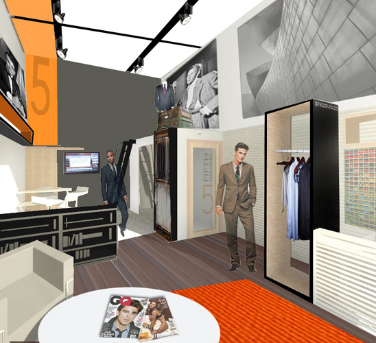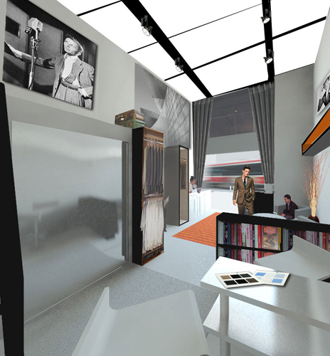 The modest budget was maintained through ‘customization‘ of off-the-shelf components. Using their signature colors, the furniture and show room were painted to reinforce the brand. The ‘professional’ black was lined with ‘fun’ orange interiors drawing reference to the ‘serious’ exterior fabrics vs. ‘funky’ linings of their famous suits.